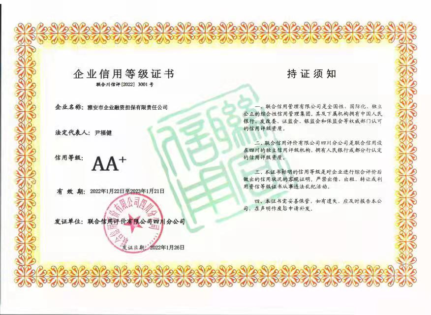 聯(lián)合信用評價有限公司是我國信用行業(yè)資質(zhì)最全、服務(wù)區(qū)域最廣,覆蓋規(guī)模最大的信用信息服務(wù)機構(gòu)之一。近期,該公司先后為四川省信用再擔(dān)保有限公司、成都市現(xiàn)代農(nóng)業(yè)融資擔(dān)保有限公司、瀘州市興瀘融資擔(dān)保集團(tuán)有限公司、眉山市眉州融資擔(dān)保有限公司等20余家川內(nèi)擔(dān)保機構(gòu)開展2022年度評級工作,共評出了兩家AA+擔(dān)保機構(gòu),其中就有雅安市擔(dān)保公司。