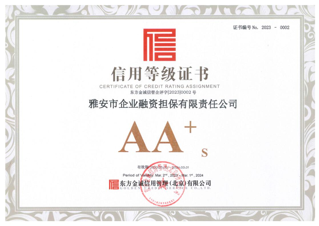 3月3日,雅安市企業(yè)融資擔(dān)保有限責(zé)任公司(以下簡(jiǎn)稱“市擔(dān)保公司”)傳來喜訊,經(jīng)東方金誠信用管理(北京)有限公司通過對(duì)市擔(dān)保公司的信用狀況進(jìn)行綜合分析和評(píng)估,確定該公司信用等級(jí)為AA+。
