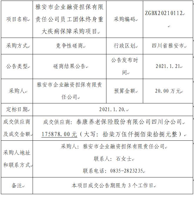員工團體終身重大疾病保障采購項目競爭性磋商結果公告
